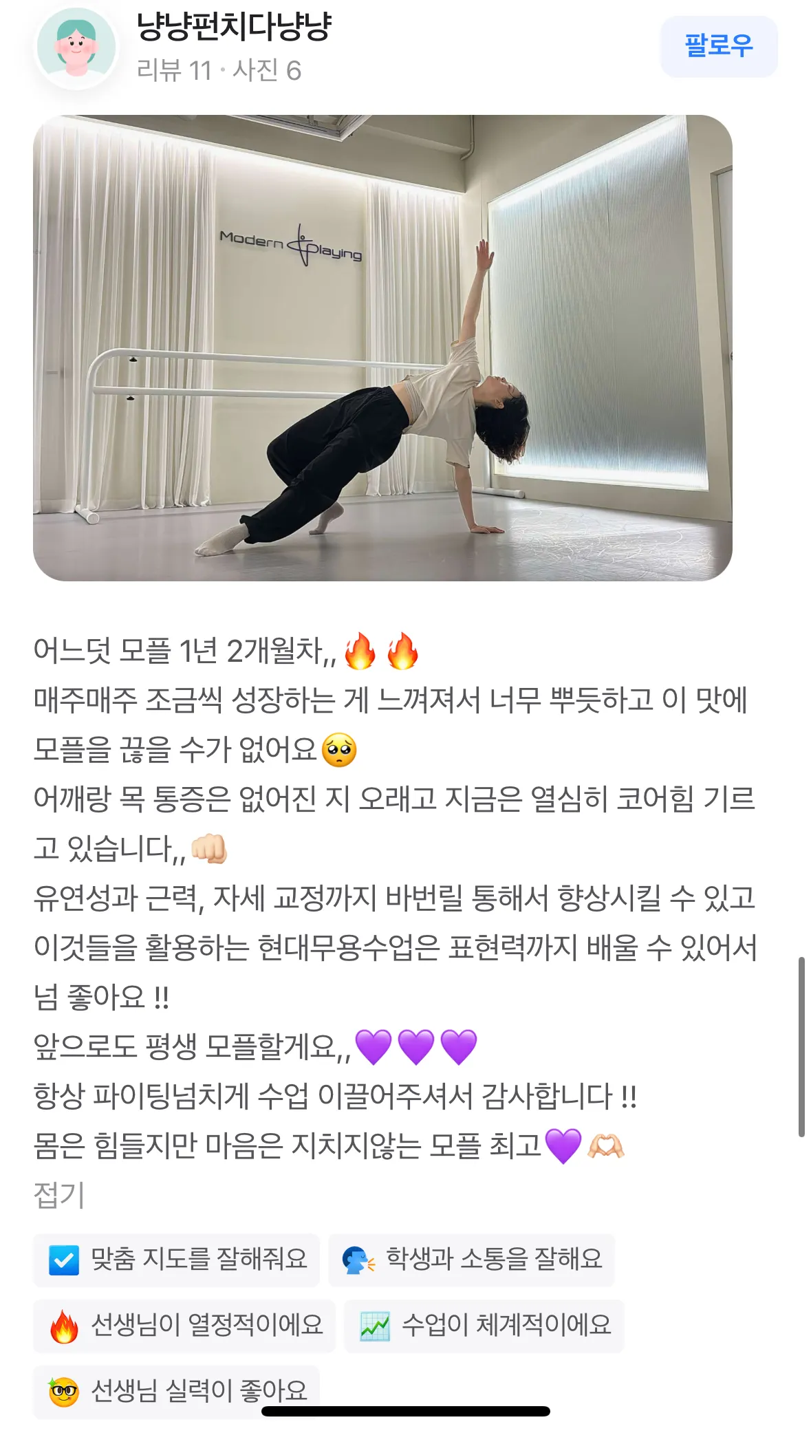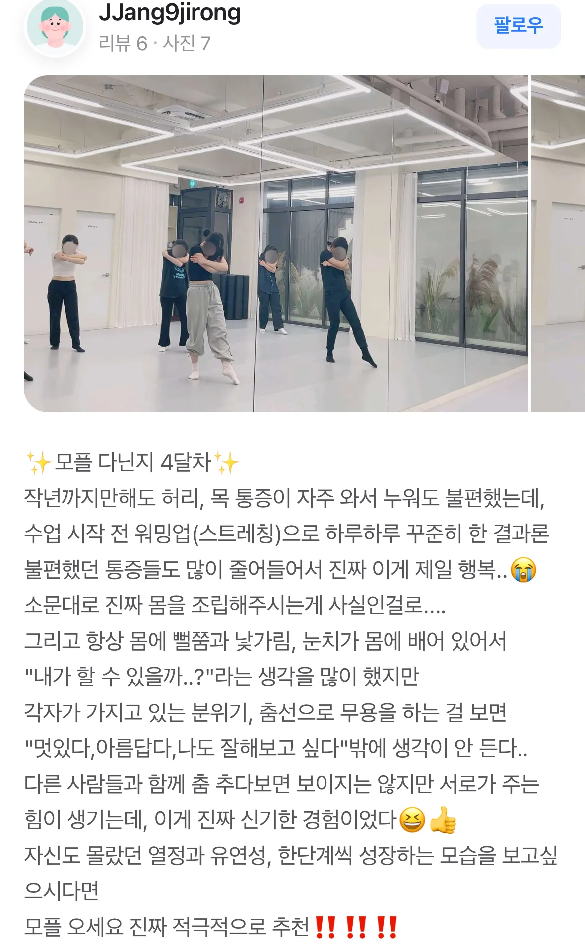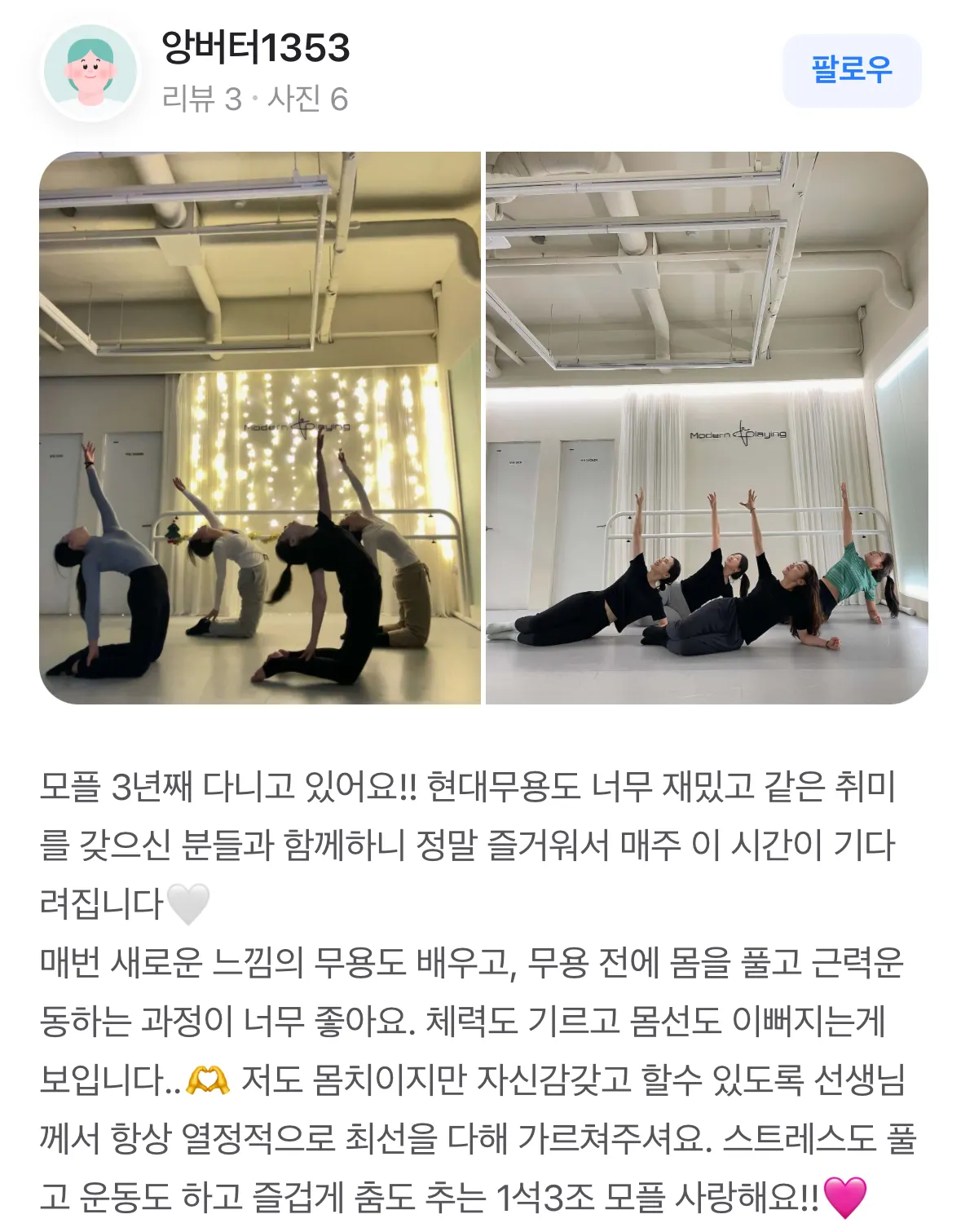 6년 간 소그룹 형태로 진행하다 2022년 2월 홍대에 스튜디오를 오픈하며 현대무용과 바디번 & 릴리즈 (그룹 스트레칭) 수업을 통해 모플러 분들의 몸과 마음을 활짝 펴고 있습니다.