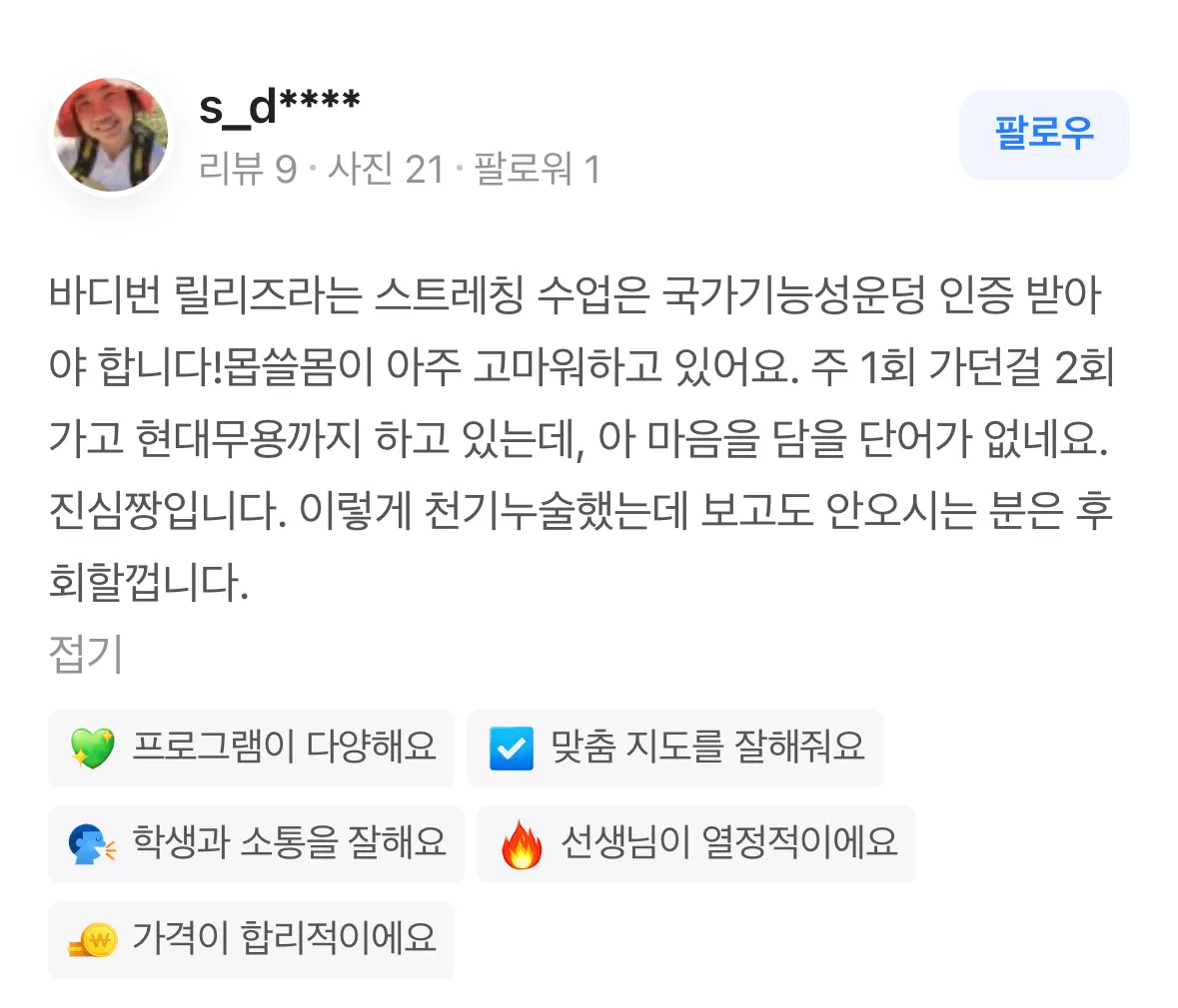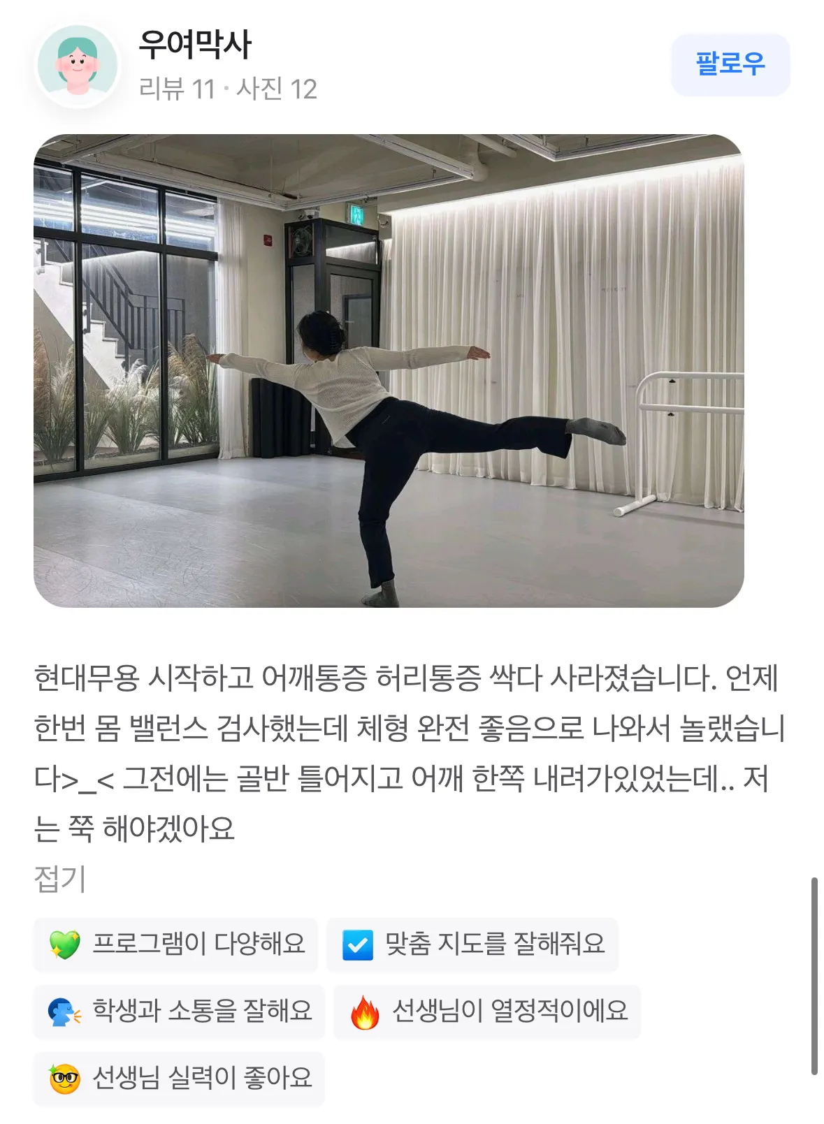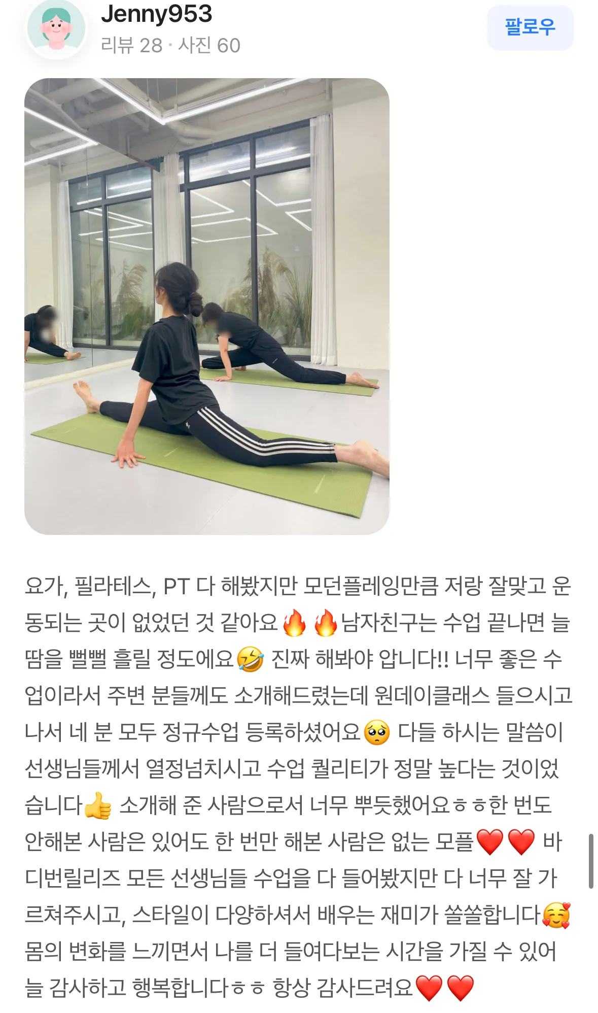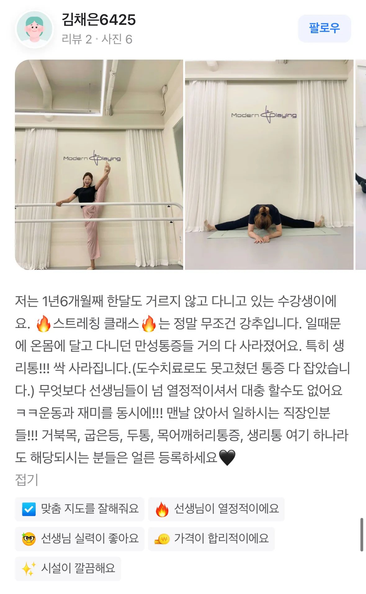 6년 간 소그룹 형태로 진행하다 2022년 2월 홍대에 스튜디오를 오픈하며 현대무용과 바디번 & 릴리즈 (그룹 스트레칭) 수업을 통해 모플러 분들의 몸과 마음을 활짝 펴고 있습니다.